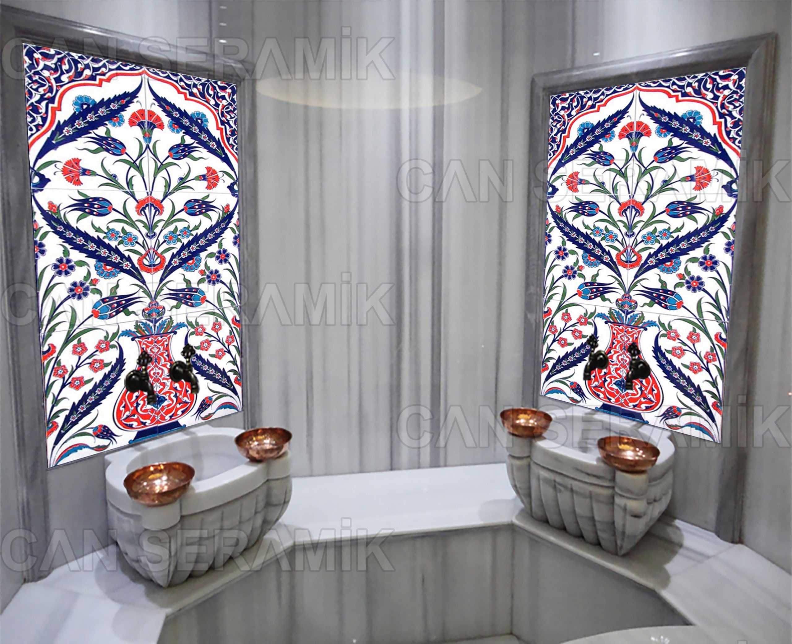 - Türk hamamlarında kurna arkası çini pano veya kurna üstü çini pano olarak,